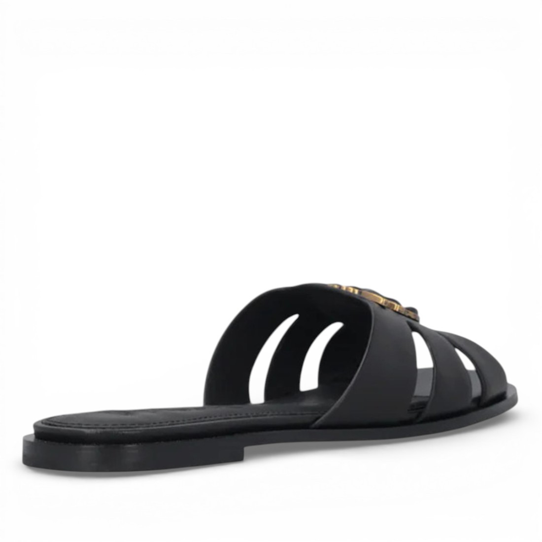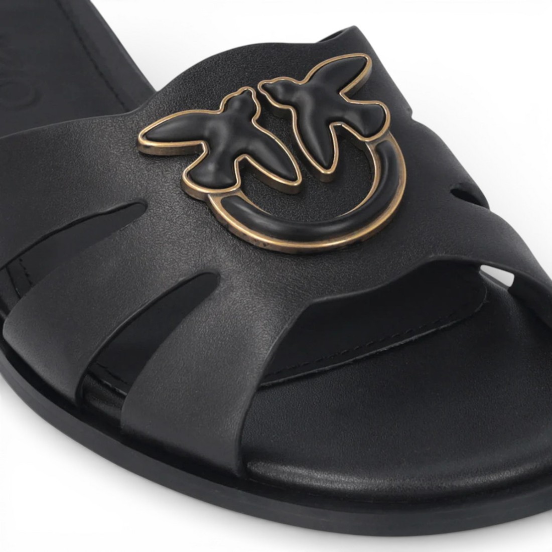 Schwarze Kalbslederslipper mit seitlichen Aussparungen, verziert mit dem Love Birds-Logo aus Metall und einer Innenprägung. Die weiche Innensohle garantiert Komfort, während die extraflache Gummisohle für Stabilität bei jedem Schritt sorgt. Mit ihrem urbanen und zeitgemäßen Stil sind sie perfekt für das Leben in der Stadt, ohne dabei auf Stil zu verzichten.
