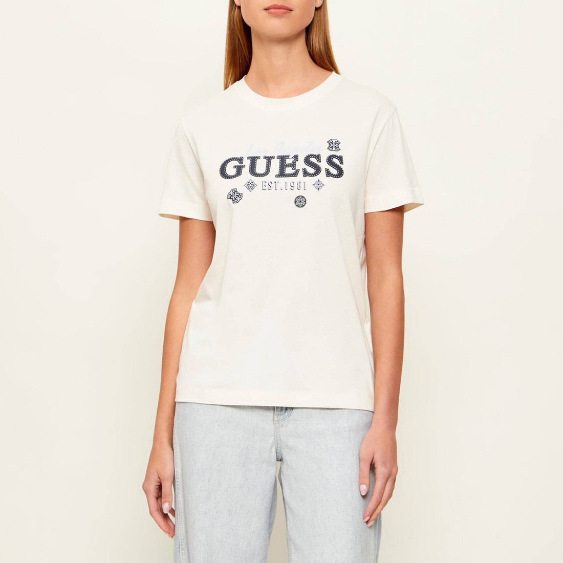 T-Shirt Guess aus 100 % beiger Baumwolle, leicht und bequem für den täglichen Gebrauch. Das weiße Design wird durch den Logodruck auf der Vorderseite aufgewertet, der für einen unverwechselbaren und wiedererkennbaren Touch sorgt. Normale Passform, einfach zu kombinieren mit Jeans, Shorts oder Sporthosen für einen einfachen, aber gepflegten Freizeitlook. Ideal für die Freizeit und die wärmere Jahreszeit.