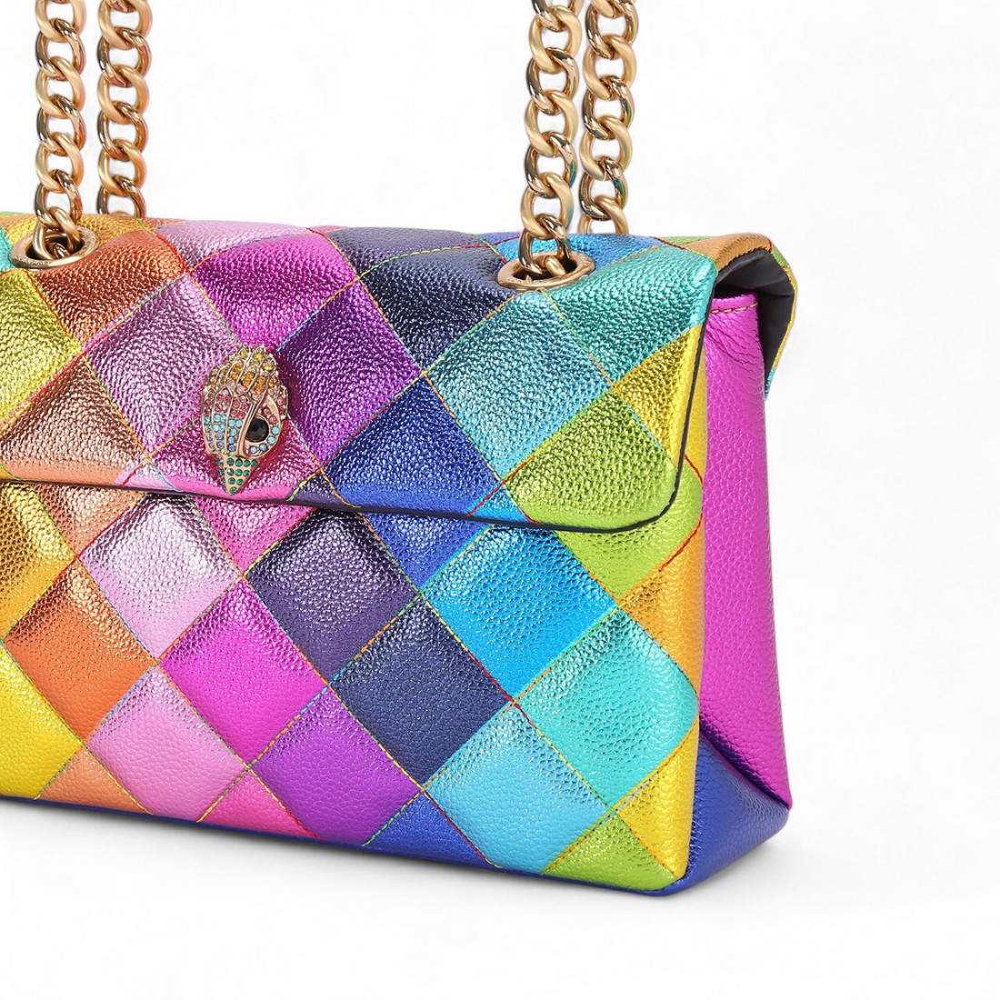 Das elegante und raffinierte Kensington Portemonnaie aus gehämmertem Leder mit Rautenmuster ist vom Design des Schaufensters in der Oxford Street inspiriert. Das markante Detail ist der goldene Adlerkopf mit mehrfarbigen Kristallen auf der vorderen Klappe. Ausgestattet mit einem Schulterriemen aus Goldkette mit gepolsterten Einsätzen, Magnetverschluss, Innentasche und zwei Hauptfächern, bietet sie Stil und Funktionalität in den Maßen 26 x 17 x 8 cm.