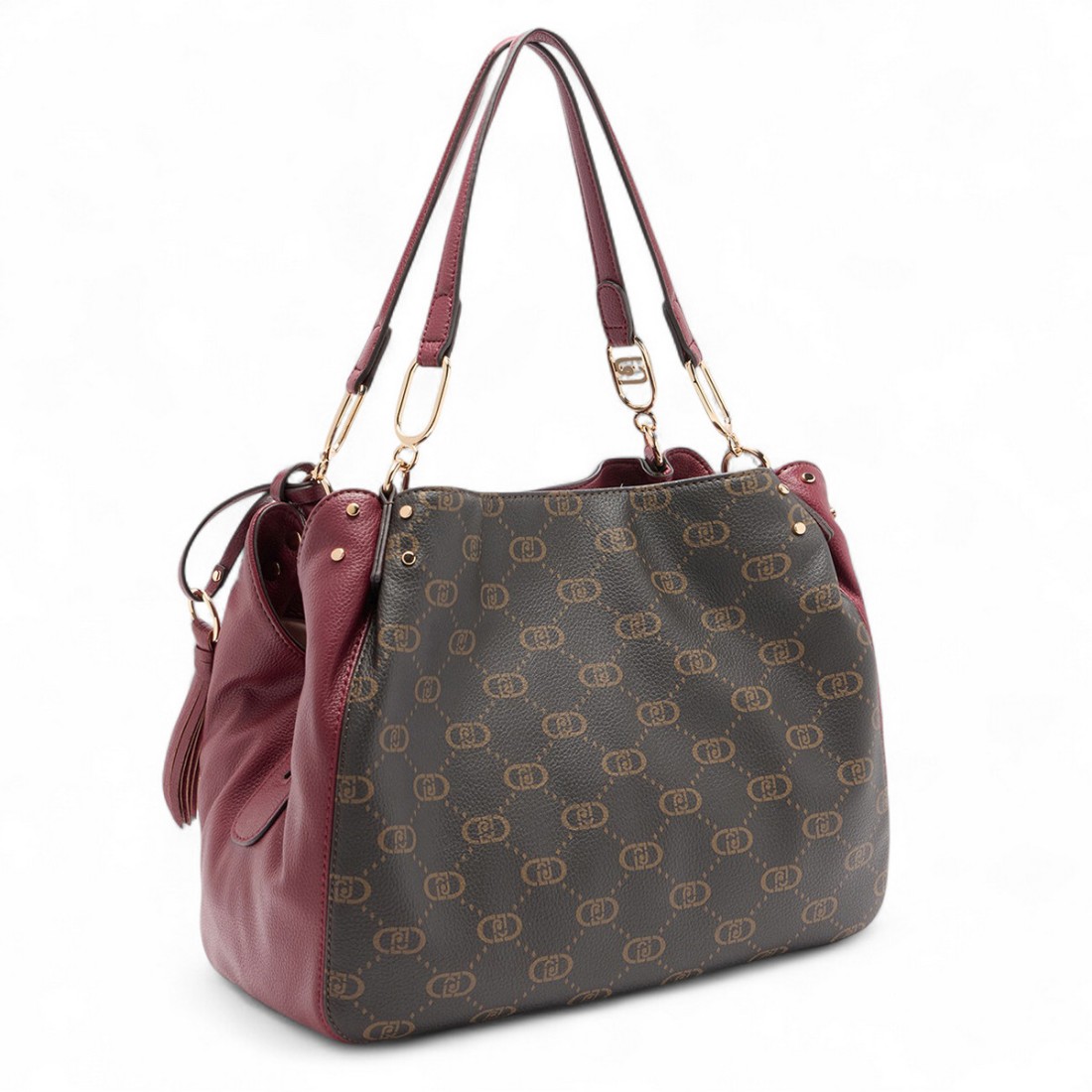 Elegante mittelgroße LIU JO Einkaufstasche aus braunem und rotem Kunstleder mit Trommeleffekt. Sie ist mit einem Logoaufdruck aus Metall versehen und hat bequeme Henkel und einen Quastenanhänger. Sie hat zwei Fächer, eines davon mit Reißverschluss, und ein praktisches Innenfach mit Reißverschluss. Maße 32 x 14 x 26 cm, ideal für jede Gelegenheit mit Stil und Funktionalität.Unser Kundenservice steht Ihnen von Montag bis Samstag von 10:00 bis 19:30 Uhr zur Verfügung