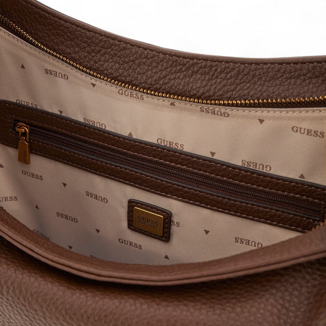 Entdecken Sie die Camden Umhängetasche von Guess aus elegantem braunem Kunstleder, perfekt für jede Gelegenheit. Mit einem Reißverschluss, goldenen Metallbeschlägen und einem Metalllogo auf der Vorderseite vereint sie Stil und Zweckmäßigkeit. Der geräumige Innenraum mit Reißverschlussfach sorgt für Ordnung und Komfort. Maße 26x39x9 cm.Unser Kundenservice steht Ihnen von Montag bis Samstag von 10:00 bis 19:30 Uhr zur Verfügung