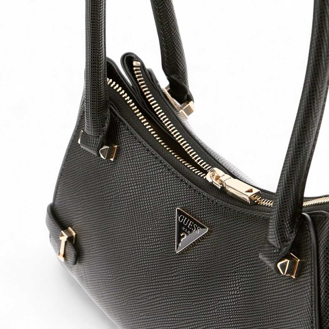 Entdecken Sie die GUESS Rosalba Schultertasche aus Kunstleder mit raffinierter Saffiano-Verarbeitung. Sie ist elegant und praktisch und verfügt über einen Reißverschluss, silberfarbene Metallbeschläge und das ikonische Logo-Dreieck aus Metall auf der Vorderseite. Mit den Maßen 28x15x11 cm ist sie perfekt, um Ihren Alltagslook stilvoll zu ergänzen.