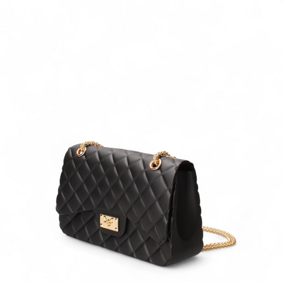 Schwarze PVC-Schultertasche mit gestepptem Effekt, Überschlag und Drehhakenverschluss mit Logo. Der Schulterriemen aus Kette und PVC verleiht der Tasche einen modernen und raffinierten Touch, perfekt für jede Gelegenheit. Kompakte Abmessungen 25x15x7 cm, ideal, um schicke und moderne Looks mit Stil und Funktionalität zu vervollständigen.Unser Kundenservice steht Ihnen von Montag bis Samstag von 10:00 bis 19:30 Uhr zur Verfügung