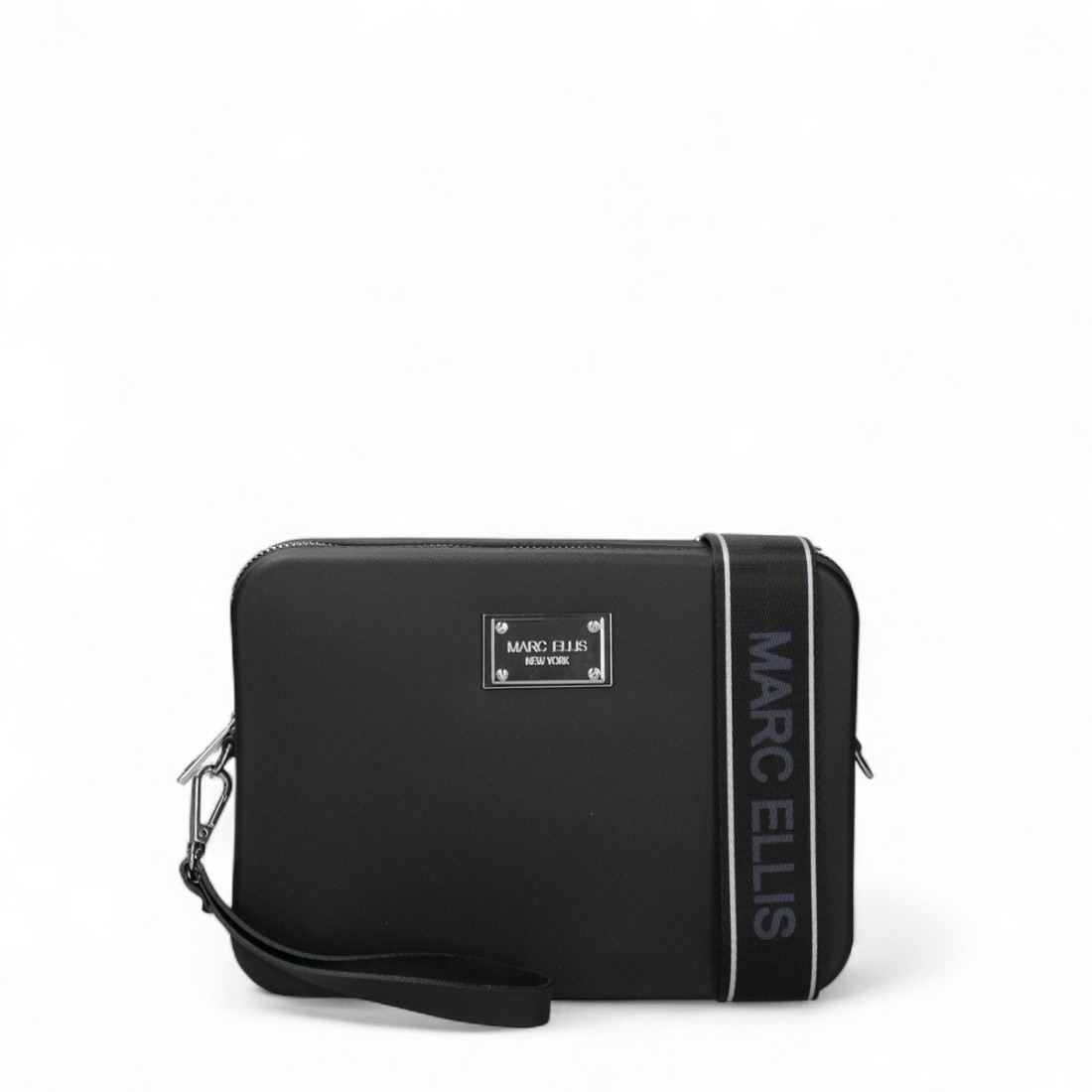 Umhängetasche Marc Ellis Flat Flowe aus schwarzem PVC mit monogrammierter Metallplakette auf der Vorderseite. Ausgestattet mit einem Schulterriemen aus Stoff mit Logo und einem Handgelenkriemen aus PVC, beide abnehmbar. Reißverschluss und galvanische Details aus Rotguss. Kompakt und vielseitig, ideal für einen urbanen und modernen Stil. Maße: 24x17x5 cm. Perfekt, um jeden Look mit Eleganz zu vervollständigen.Unser Kundenservice steht Ihnen von Montag bis Samstag von 10:00 bis 19:30 Uhr zur Verfügung