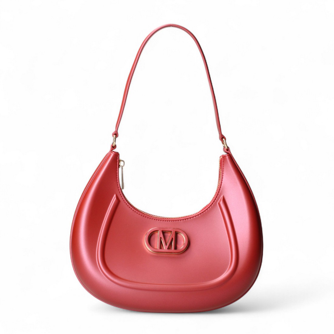 Elegante Hobo-Umhängetasche aus dahlienrotem PVC mit geprägtem Monogramm-Logo auf der Vorderseite. Ausgestattet mit abnehmbarem und verstellbarem Schulterriemen aus Stoff und praktischem Reißverschluss. Galvanische Vergoldung. Perfekt für jede Gelegenheit, vereint sie modernen Stil und Funktionalität in den kompakten Abmessungen von 26x21x5 cm.Unser Kundenservice steht Ihnen von Montag bis Samstag von 10:00 bis 19:30 Uhr zur Verfügung
