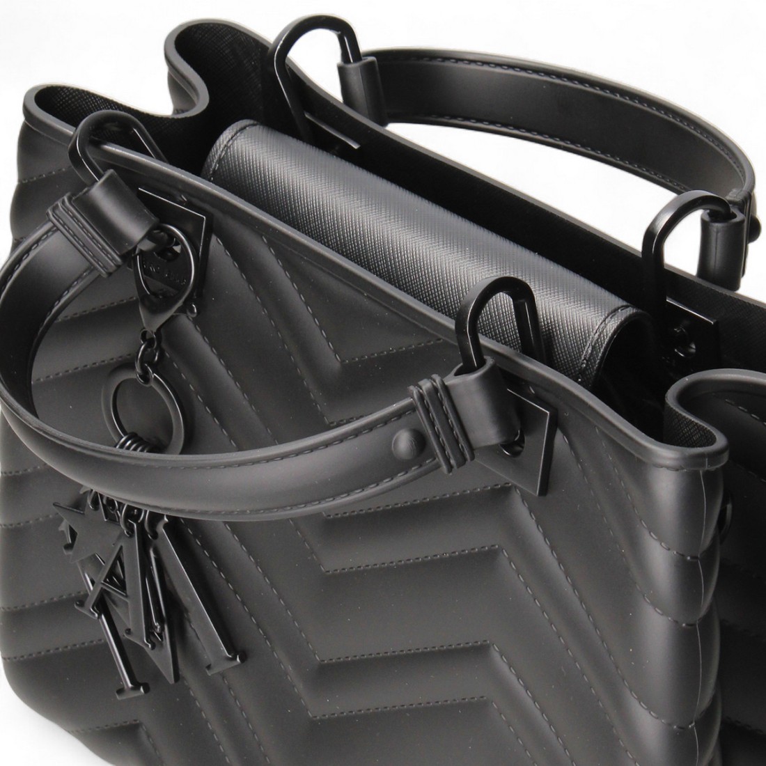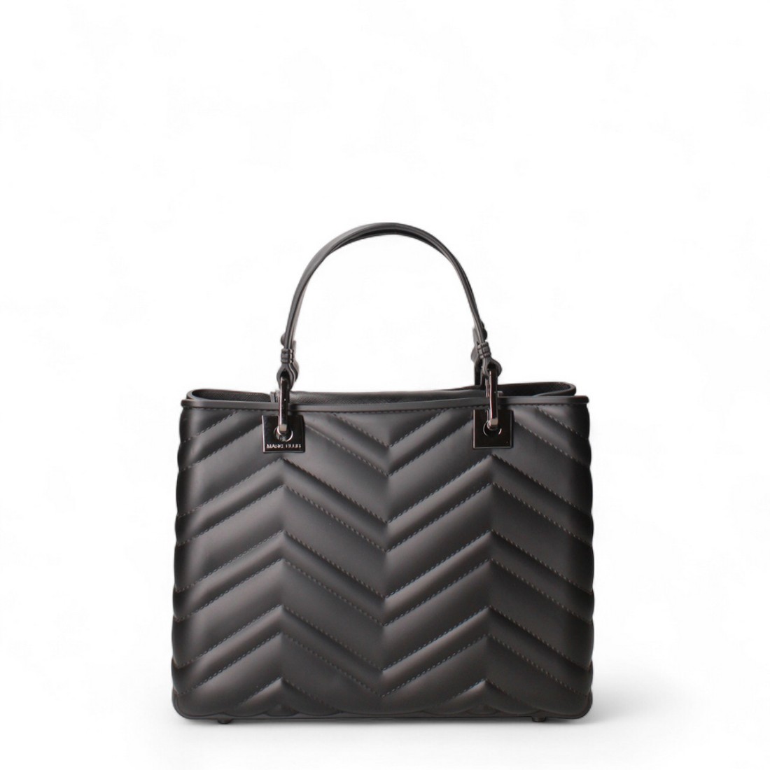 Entdecken Sie die Handtasche Marc Ellis aus schwarzem PVC mit wellenförmigem Steppeffekt, elegant und raffiniert. Der abnehmbare Logoanhänger verleiht der Tasche einen unverwechselbaren Touch, während die doppelten PVC-Griffe und der abnehmbare Logobügel für Vielseitigkeit sorgen. Der knopflose Verschluss der Innenklappe ist praktisch und wird durch galvanische Details aus Rotguss ergänzt. Die kompakte und funktionelle Tasche mit den Maßen 21x15x7 cm ist perfekt für jede Gelegenheit.Unser Kundenservice steht Ihnen von Montag bis Samstag von 10:00 bis 19:30 Uhr zur Verfügung