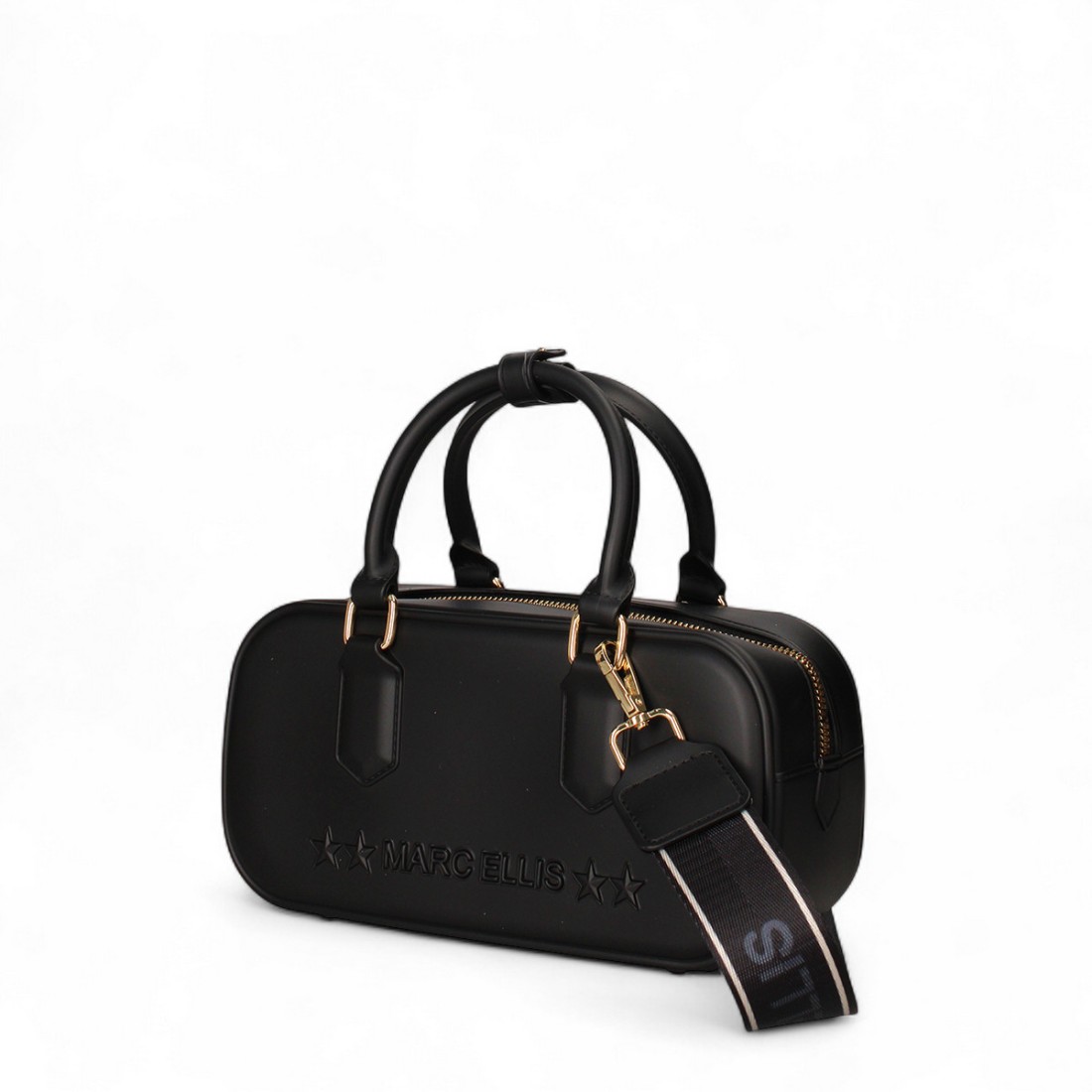Elegante Handtasche Marc Ellis aus schwarzem PVC mit Ton-in-Ton geprägtem Logo auf der Vorderseite. Ausgestattet mit doppelten Henkeln aus PVC und einem verstellbaren, abnehmbaren Schulterriemen aus Logostoff. Reißverschluss und goldene Details sorgen für einen raffinierten Touch. Maße 35x25x9 cm, perfekt, um jedem Alltagslook Stil und Klasse zu verleihen.