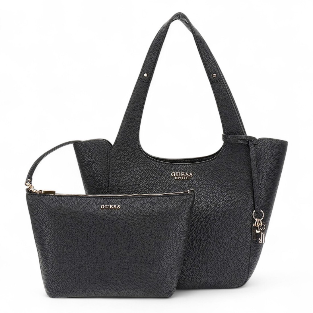 Tasche Guess aus strapazierfähigem, schwarzem Naturlederimitat. Mit ihrem strukturierten und kompakten Design ist sie ideal für alle, die Stil und Zweckmäßigkeit suchen. Sie hat ein einziges Reißverschlussfach und ein flaches Innenfach für kleine Gegenstände. Die 24 cm hohen Griffe ermöglichen ein bequemes Tragen über der Schulter. Abmessungen: 26/45 x 26 x 13 cm. Hartschalenkoffer, nicht für A4-Formate geeignet.Unser Kundenservice steht Ihnen von Montag bis Samstag von 10:00 bis 19:30 Uhr zur Verfügung