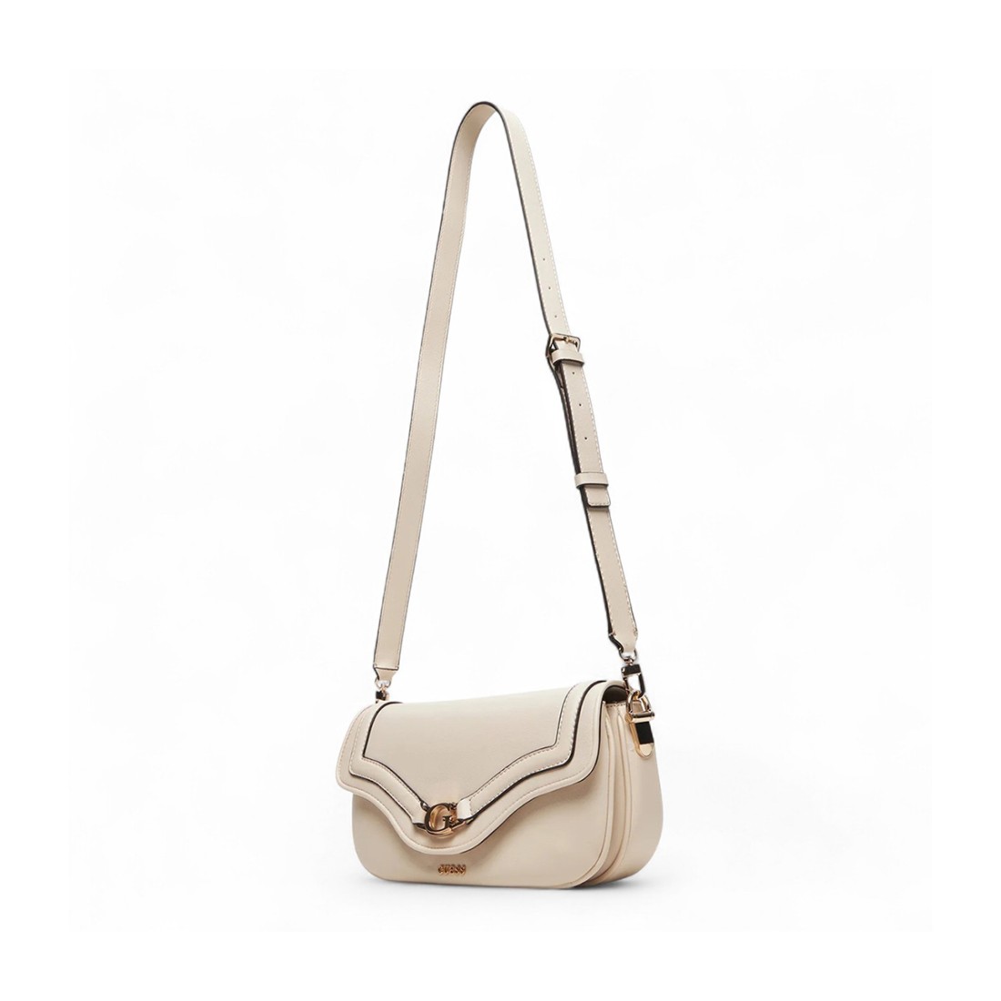 Elegante kleine Tasche Guess in Weiß aus hochwertigem Naturlederimitat. Das stabile und kompakte Design (29 x 15 x 6 cm) bietet einen raffinierten und modernen Stil. Sie verfügt über einen Klappverschluss mit Magnetclip, ein Hauptfach, zwei Reißverschlussfächer und ein flaches Fach. Die Henkel sind 26 cm hoch und der Riemen ist bis zu 130 cm verstellbar, um einen vielseitigen Tragekomfort bei jeder Gelegenheit zu gewährleisten.