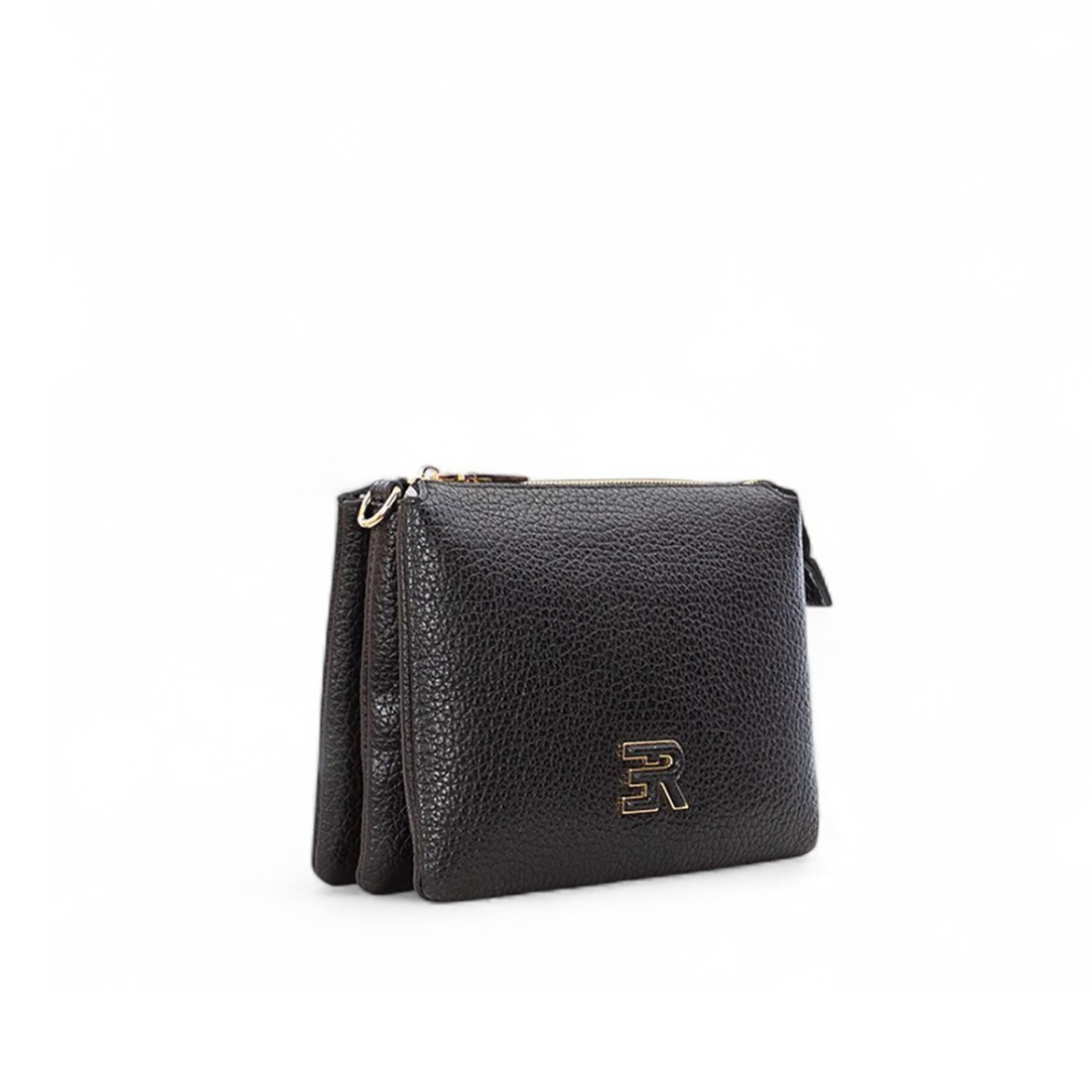 Ermanno Scervino Unity Triple Crossbody Bag aus schwarzem gehämmertem Kunstleder, rechteckig und mittelgroß (B 26 x H 16 x T 8 cm). Drei identische Fächer mit Seitenfalten, ohne Henkel, aber mit verstellbarem und abnehmbarem Schulterriemen. Reißverschluss oben, gefütterter Innenraum mit offenen Fächern. Geprägtes schwarzes ER-Logo mit goldenen Details auf der Vorderseite und goldenes Ermanno Firenze -Logo auf der Rückseite. Elegant und vielseitig, perfekt für den Tag und den Abend.