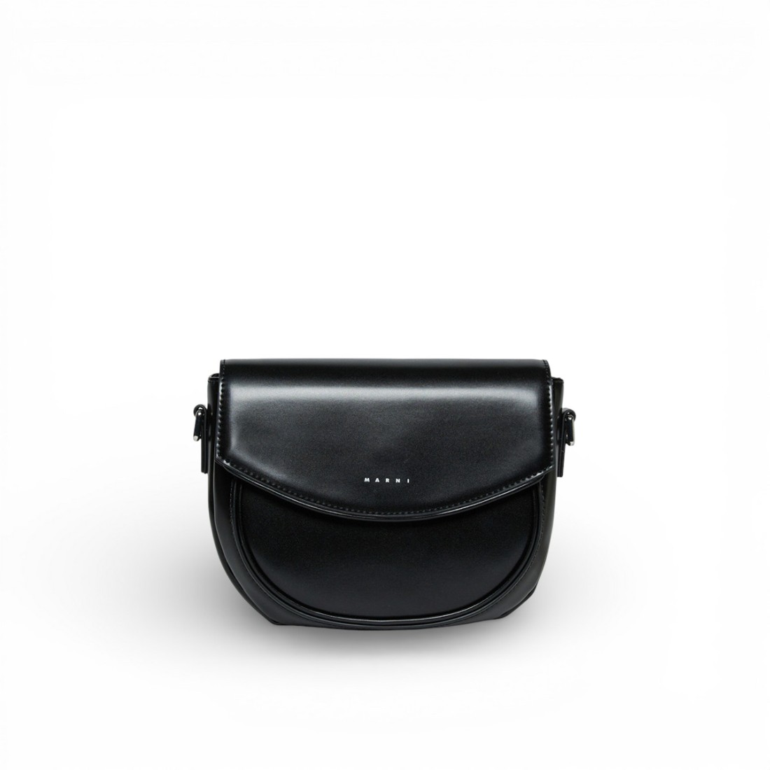 Smile Bag Marni aus schwarzem beschichtetem Kunstleder mit kontrastierendem Logo-Schriftzug. Wesentliche Linien und kompaktes Format, leicht und praktisch, um die Kleinen jeden Tag zu begleiten. Magnetverschluss, abnehmbarer Schultergurt, auf der Schulter oder in der Hand zu tragen. Innenraum mit einem einzigen Fach.