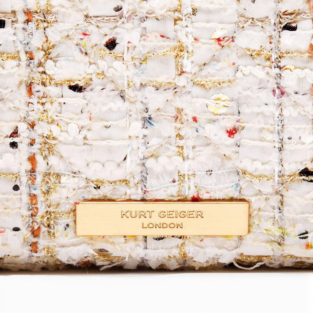 Kurt Geiger London Tweed Mini Kensington Umhängetasche aus elegantem, knochenfarbenem Tweed-Stoff. Die Vorderseite ist mit dem ikonischen Adler und zarten floralen Verzierungen geschmückt. Fester Kettenschulterriemen, Überschlagverschluss und Magnetknopf. Maße: 20 x 14 x 6 cm.Unser Kundenservice steht Ihnen von Montag bis Samstag von 10:00 bis 19:30 Uhr zur Verfügung