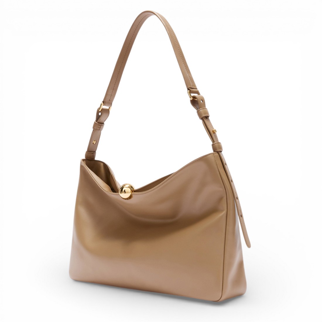 Elegante Linien und raffinierter Charme zeichnen die Sfera Soft Tasche von Furla aus. Sie ist aus weich gepolstertem Nappaleder in der Farbe Toffee gefertigt und zeichnet sich durch die runde Sfera-Hardware aus, die einen zarten Drapierungseffekt erzeugt. Sie ist geräumig und flexibel und eignet sich perfekt für den täglichen Gebrauch. Ausgestattet mit zwei offenen Innentaschen, einer Reißverschlusstasche, verstellbarem Griff, Metallfüßen und Magnetknopfverschluss. Maße: 37 x 25 x 8 cm.