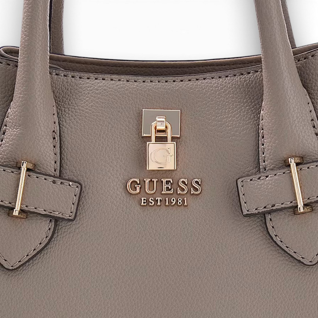 Handtasche Guess Yesba aus dunklem taupefarbenem Kunstleder mit Trommeleffekt, elegant und geräumig, perfekt für den täglichen Gebrauch. Das Design ist mit dem Logo auf der Vorderseite und einem abnehmbaren Anhänger verziert, der der Tasche einen besonderen Touch verleiht. Ausgestattet mit einem doppelten Kunstledergriff, einer Gesäßtasche und einem Hauptverschluss mit Reißverschluss für zusätzliche Sicherheit. Maße: 37 x 29 x 12 cm.Unser Kundenservice steht Ihnen von Montag bis Samstag von 10:00 bis 19:30 Uhr zur Verfügung