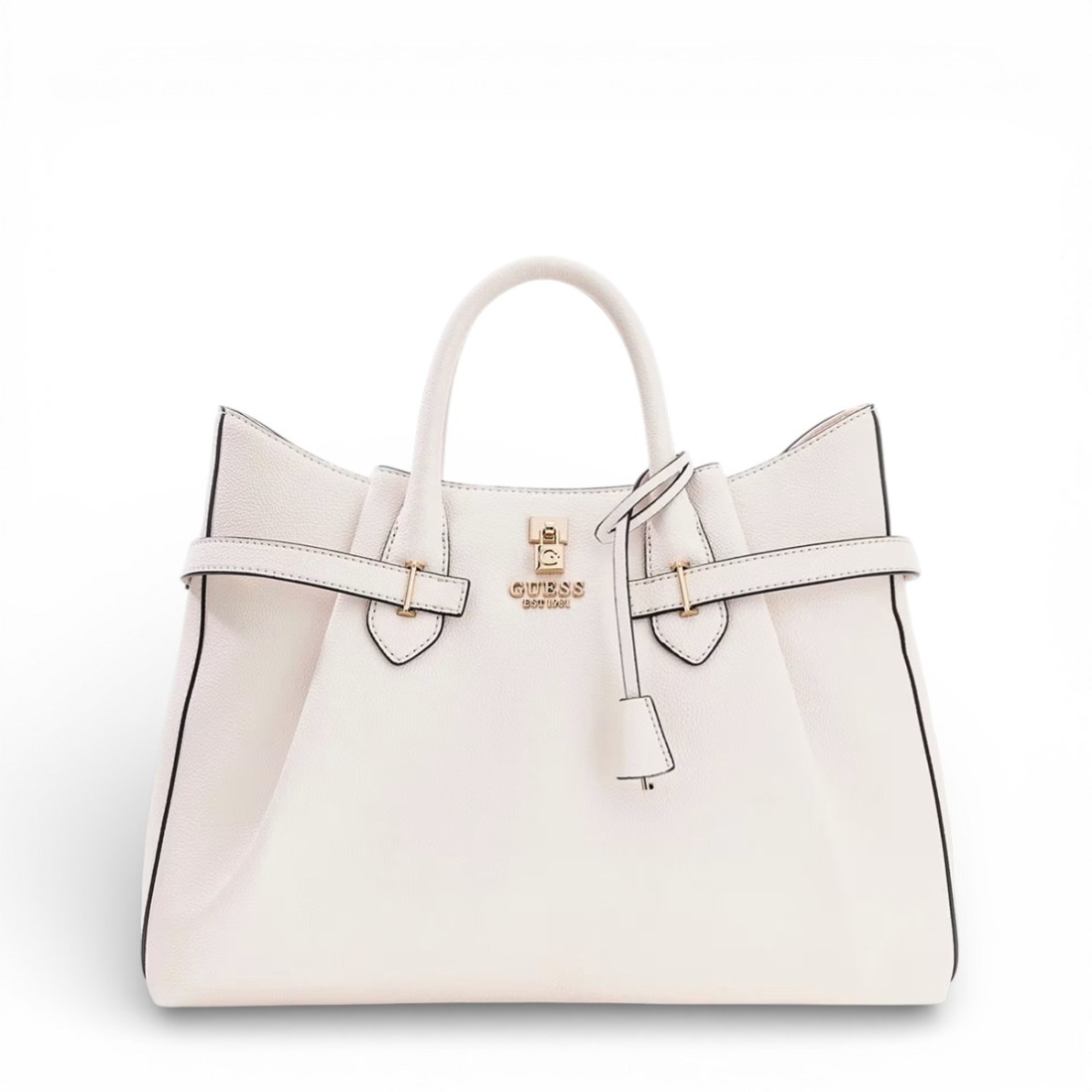 Handtasche Guess Yesba aus cremefarbenem Kunstleder mit Trommeleffekt, elegant und geräumig, perfekt für den täglichen Gebrauch. Das Design ist mit dem Logo auf der Vorderseite und einem abnehmbaren Anhänger verziert, der der Tasche einen besonderen Touch verleiht. Ausgestattet mit einem doppelten Kunstledergriff, einer Gesäßtasche und einem Hauptverschluss mit Reißverschluss für zusätzliche Sicherheit. Maße: 37 x 29 x 12 cm.