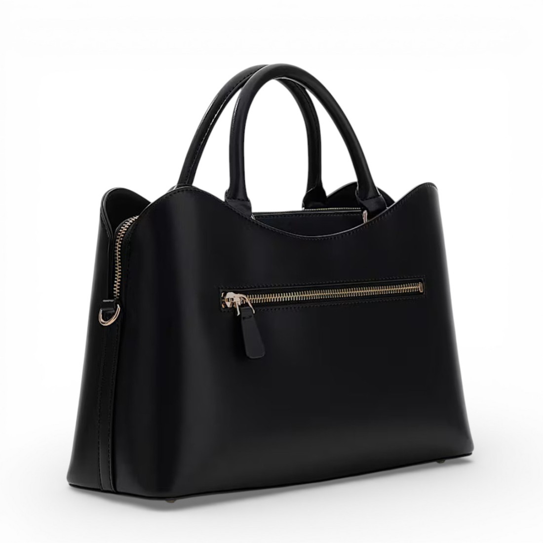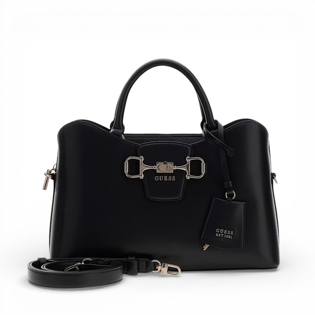 Entdecken Sie die elegante und vielseitige Handtasche Janie von GUESS aus schwarzem Kunstleder. Sie verfügt über einen Schriftzug und einen abnehmbaren Anhänger auf der Vorderseite, doppelte Henkel und einen verstellbaren Schulterriemen, der zu jedem Stil passt. Das zentrale Reißverschlussfach und die beiden Seitenfächer mit Magnetknopf sind praktisch und übersichtlich. Kompakte Größe: 32x21x11 cm, perfekt, um jeden Look mit Klasse zu vervollständigen.Unser Kundenservice steht Ihnen von Montag bis Samstag von 10:00 bis 19:30 Uhr zur Verfügung