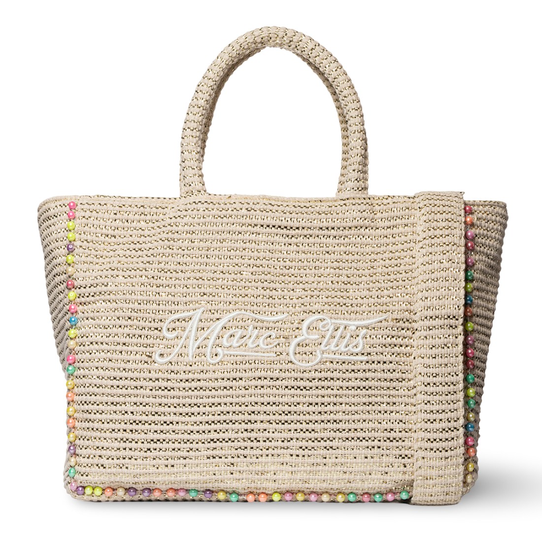 Entdecken Sie die Strandtasche Marc Ellis aus beigem Raffiapapier mit 02-Variationen-Muster. Sie ist kühn und funktional und verfügt über ein gesticktes Logo auf der Vorderseite, doppelte Henkel und einen abnehmbaren Schulterriemen aus Stoff. Der Magnetknopfverschluss macht sie praktisch, ohne auf Stil zu verzichten. Maße: 40x35x15 cm. Perfekt, um Ihre Sommerlooks mit einer raffinierten Note zu begleiten.