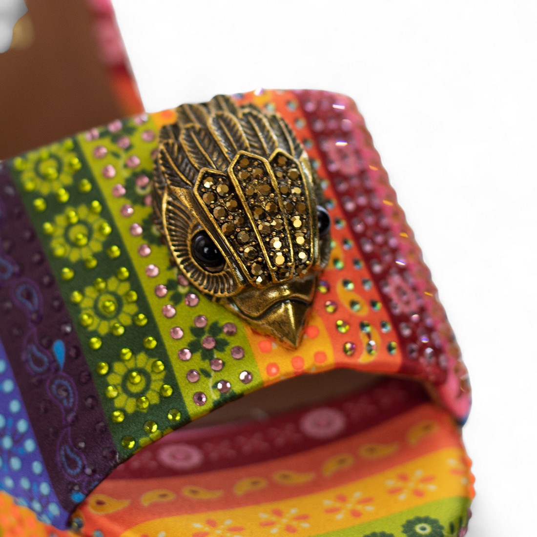 Kensington Plateausandalen aus mehrfarbigem Stoff mit Strasssteinen am ganzen Körper und einem Adlerkopf aus Messing mit Strasssteinen am Schaft. Ausgestattet mit einem Knöchelriemen, einem 12 cm hohen Absatz, einem 4 cm hohen Plateau und einer Gummisohle, kombinieren sie kühnen Stil und Komfort für einen raffinierten und originellen Look.Unser Kundenservice steht Ihnen von Montag bis Samstag von 10:00 bis 19:30 Uhr zur Verfügung