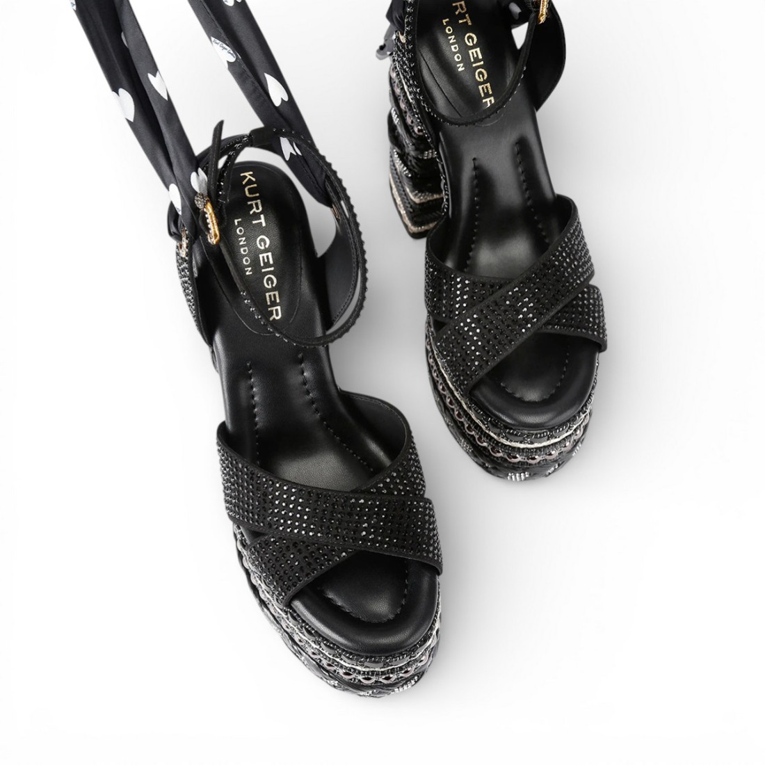 Sandal mit Chelsea Scarf Plattform mit einem starken Charakter. Die überkreuzten Riemen aus schwarzem Hahnentritt-Stoff sind mit passenden Kristallen verziert, die das Licht einfangen. Der Knöchelriemen kann mit einem eleganten, abnehmbaren Satinschal ergänzt werden. 13 cm Absatz, 5 cm Plateausohle und Gummisohle.Unser Kundenservice steht Ihnen von Montag bis Samstag von 10:00 bis 19:30 Uhr zur Verfügung