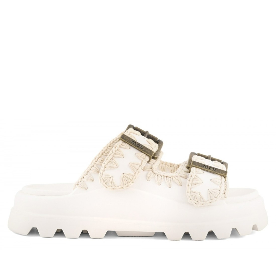 Entdecken Sie MOU, die weiße EVA-Gummisandale mit doppeltem Riemen und Häkelnähten für einen einzigartigen Touch. Mit der doppelten Schnalle können Sie die Passform leicht anpassen und so Komfort und Stil garantieren. Die Gummisohle sorgt für Widerstandsfähigkeit und Halt. Perfekt für alle, die eine vielseitige und trendige Sandale suchen, ideal für jede Gelegenheit.