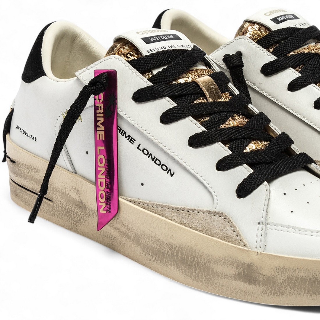 In Italien hergestellter Turnschuh aus weißem Leder mit Details aus beigem Wildleder und schwarzem Absatz mit Logo-Etikett. Mit abnehmbarem Accessoire, schwarzem Lederaufnäher auf der Rückseite und goldener Paillettenzunge. Die schwarzen Polyester-Schnürsenkel und das fuchsiafarbene, verspiegelte Etikett machen ihn einzigartig. Innenfutter aus Leder und Stoff, dunkle honigfarbene Sohle mit Vintage-Effekt für einen exklusiven und trendigen Stil.
