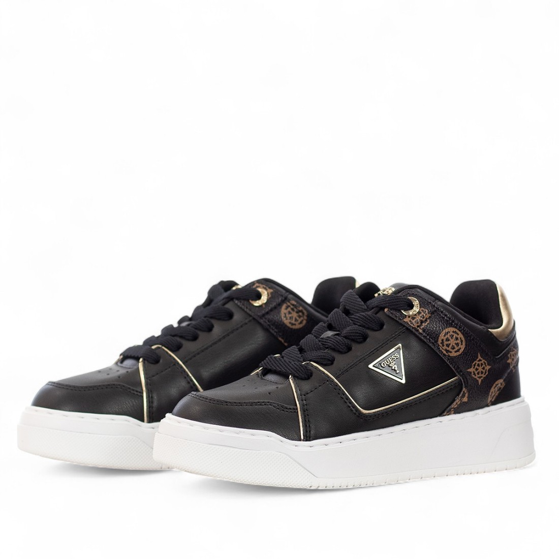 Turnschuhe Guess aus schwarzem Kunstleder mit Innenfutter und Innensohle aus Stoff. Das Design ist mit einer goldenen Logoprägung auf der Zunge und dem Schaft verziert, während das hintere Detail mit Monogramm-Print und laminiertem goldenem Aufnäher einen unverwechselbaren Touch verleiht. Eine ca. 3,5 cm hohe Sohle und eine Gummisohle sorgen für Komfort und Stabilität bei jedem Schritt.Unser Kundenservice steht Ihnen von Montag bis Samstag von 10:00 bis 19:30 Uhr zur Verfügung