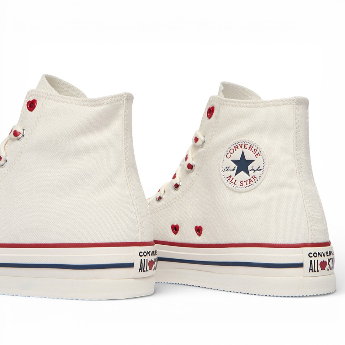 Der Converse Chuck Taylor All Star Lift Platform Valentine's Day kombiniert kultigen Stil mit romantischen Details. Sie sind aus weißem Canvas im Vintage-Stil gefertigt und verfügen über das klassische seitliche Logo und spezielle herzförmige Ösen. Die doppelten Schnürsenkel, traditionell weiß oder mit geprägten Herzen, sorgen für einen individuellen Look. Die 3 cm hohe Plateausohle aus Gummi sorgt für eine schlanke Silhouette mit Komfort und Charakter.