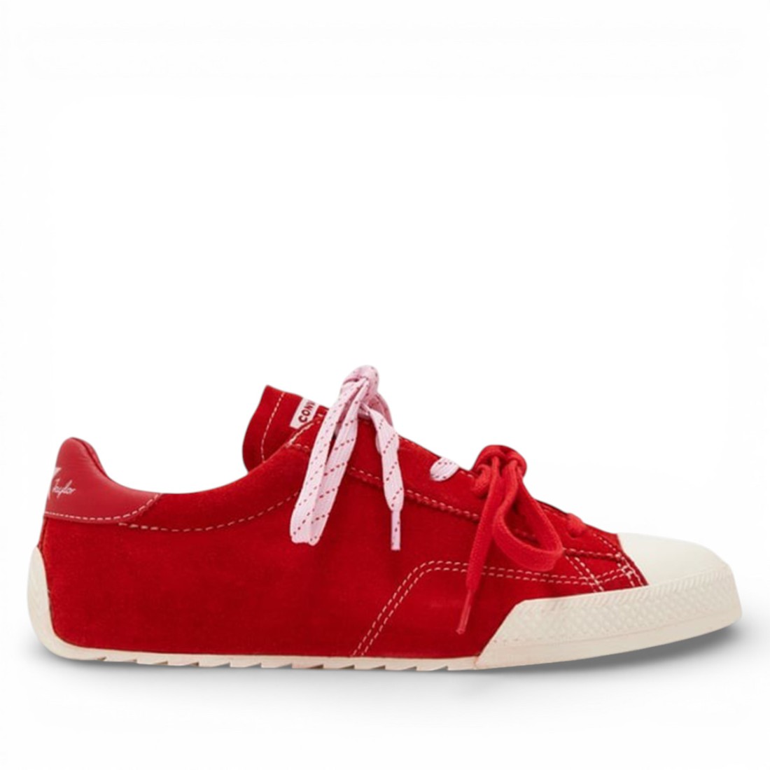 Turnschuhe Converse Chuck Taylor Lo aus weichem, rotem Wildleder mit einem kontrastierenden Einsatz aus rotem Vollnarbenleder auf der Rückseite. Das Chuck Taylor All Star-Logo ist sowohl an der Seite als auch auf der Rückseite angebracht und sorgt für einen ikonischen und wiedererkennbaren Touch. Ausgestattet mit austauschbaren Schnürsenkeln, um den Look zu individualisieren, und einer Gummiplattformsohle, die die Silhouette verschlankt und Komfort und Stabilität den ganzen Tag über gewährleistet.