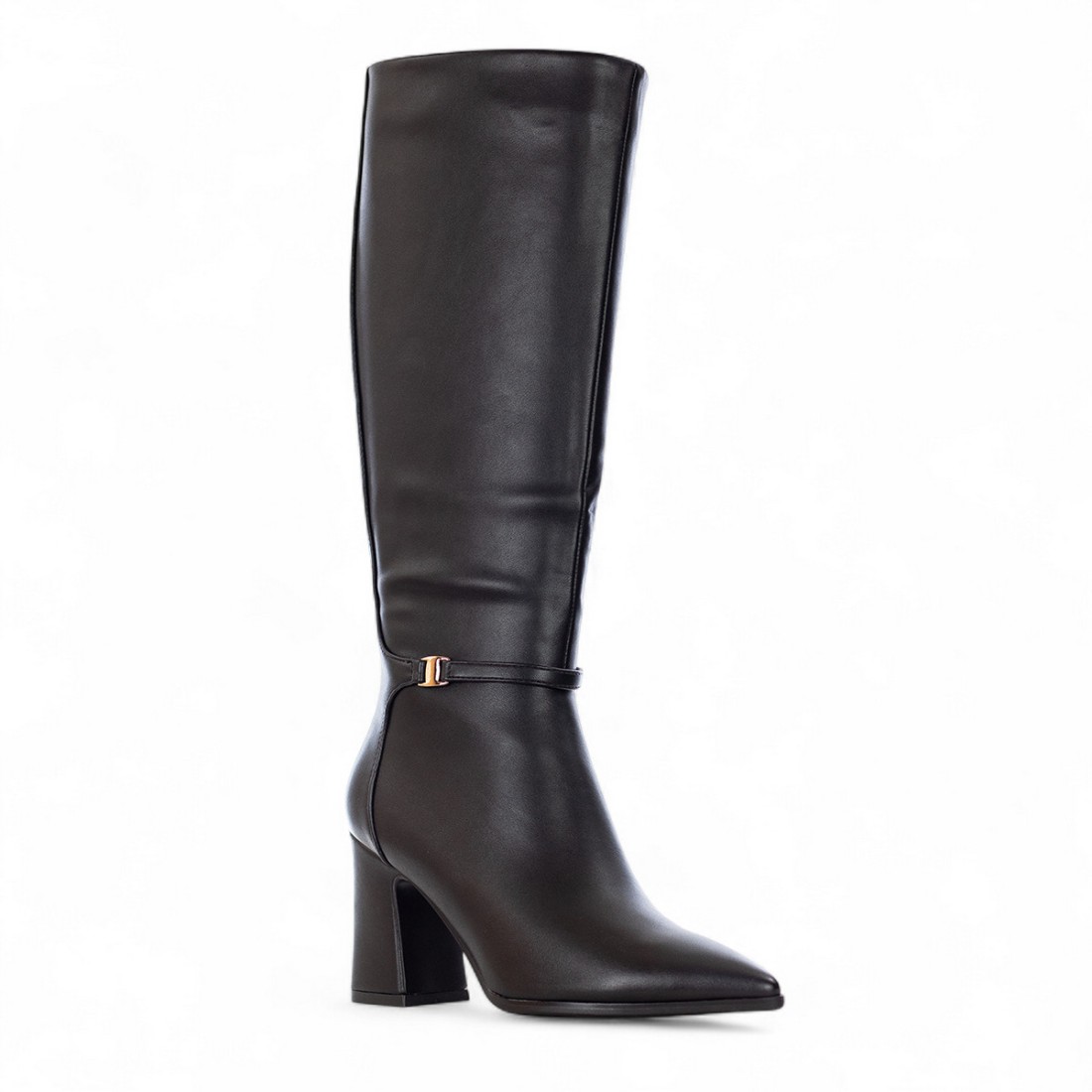 Schwarzer EXÉ-Stiefel aus Kunstleder mit Innenreißverschluss und Zierschnalle, ideal für einen eleganten und vielseitigen Stil. Er ist mit einer Gummisohle, einem 37,5 cm hohen Schaft und einem 9 cm hohen Absatz ausgestattet und bietet dank des Futters und der Innensohle aus Kunstleder einen hohen Tragekomfort. Perfekt für die Vervollständigung lässiger oder raffinierter Looks.Unser Kundenservice steht Ihnen von Montag bis Samstag von 10:00 bis 19:30 Uhr zur Verfügung