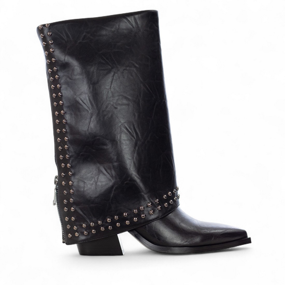 Umgeschlagener EXÉ-Stiefel aus schwarzem Lederimitat, verziert mit Nieten und Zierreißverschluss. 9 cm Absatz mit Gummisohle für einen stabilen Gang. Innenfutter aus Lederimitat und Innensohle aus Leder für Komfort und Stil. Perfekt für mutige und modische Looks, ideal zur Vervollständigung von lässigen oder urbanen Outfits.Unser Kundenservice steht Ihnen von Montag bis Samstag von 10:00 bis 19:30 Uhr zur Verfügung