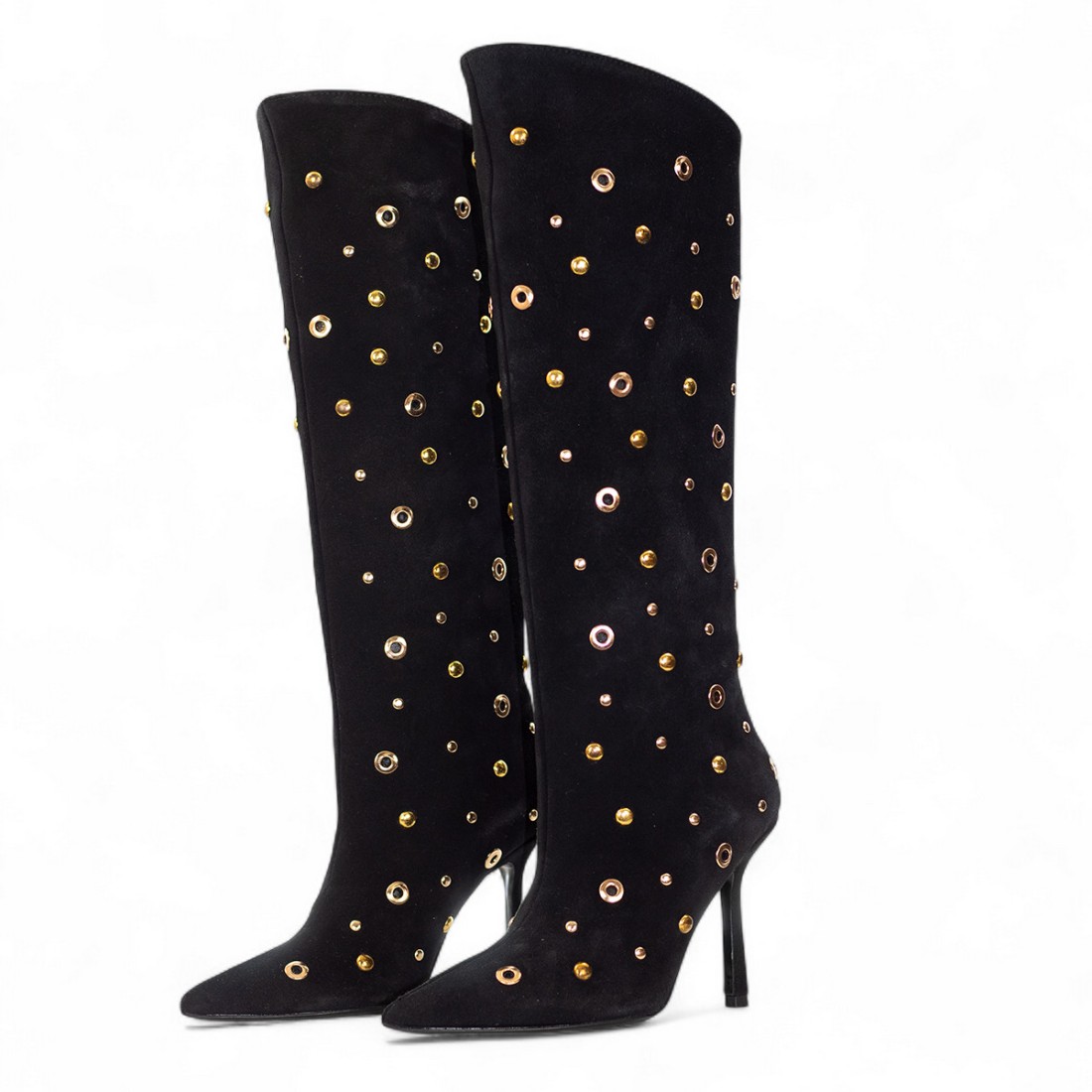 Langer Stiefel Wo Milano aus schwarzem Wildleder mit goldenen Ziernieten über und über. 100 mm hoher Absatz, robuste Gummisohle und 37 cm Schaftlänge. Innen mit Leder gefüttert für Komfort und Qualität, ideal für einen eleganten und ausgefallenen Look, perfekt um glamouröse Outfits zu jeder Jahreszeit zu vervollständigen.Unser Kundenservice steht Ihnen von Montag bis Samstag von 10:00 bis 19:30 Uhr zur Verfügung
