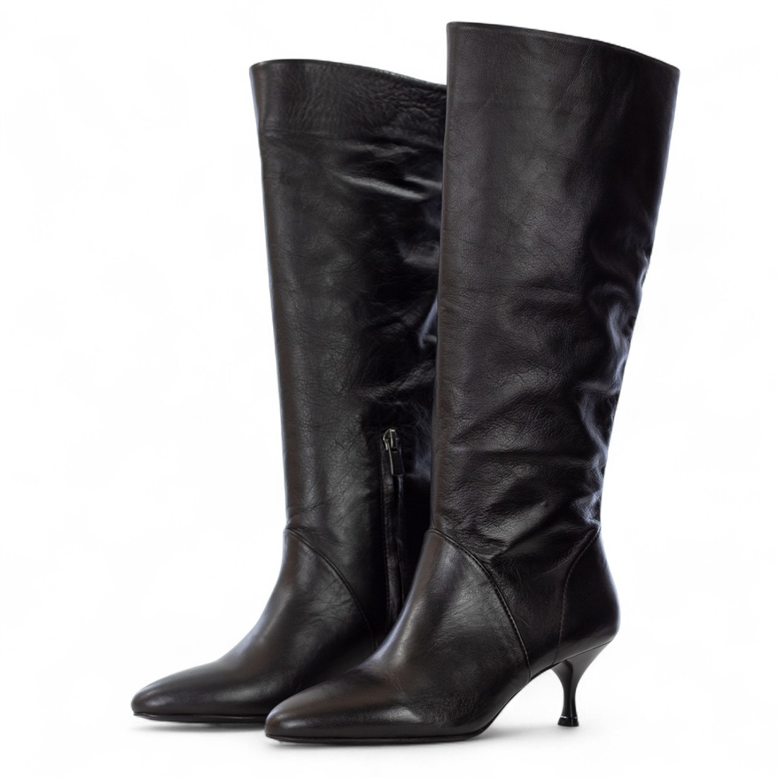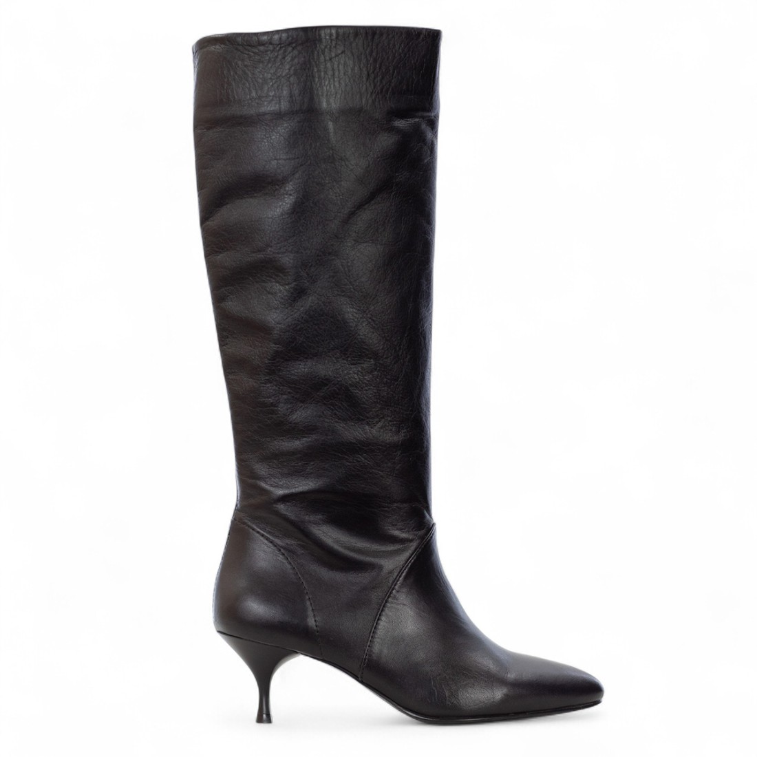 Weicher schwarzer Lederstiefel mit 60 mm Absatz, elegant und vielseitig. Der praktische seitliche Reißverschluss erleichtert das Anziehen, während das Lederfutter und die Innensohle ganztägigen Komfort bieten. Die Gummisohle garantiert Stabilität und Sicherheit bei jedem Schritt und ist somit ideal, um einen schicken Look für jede Gelegenheit zu vervollständigen.