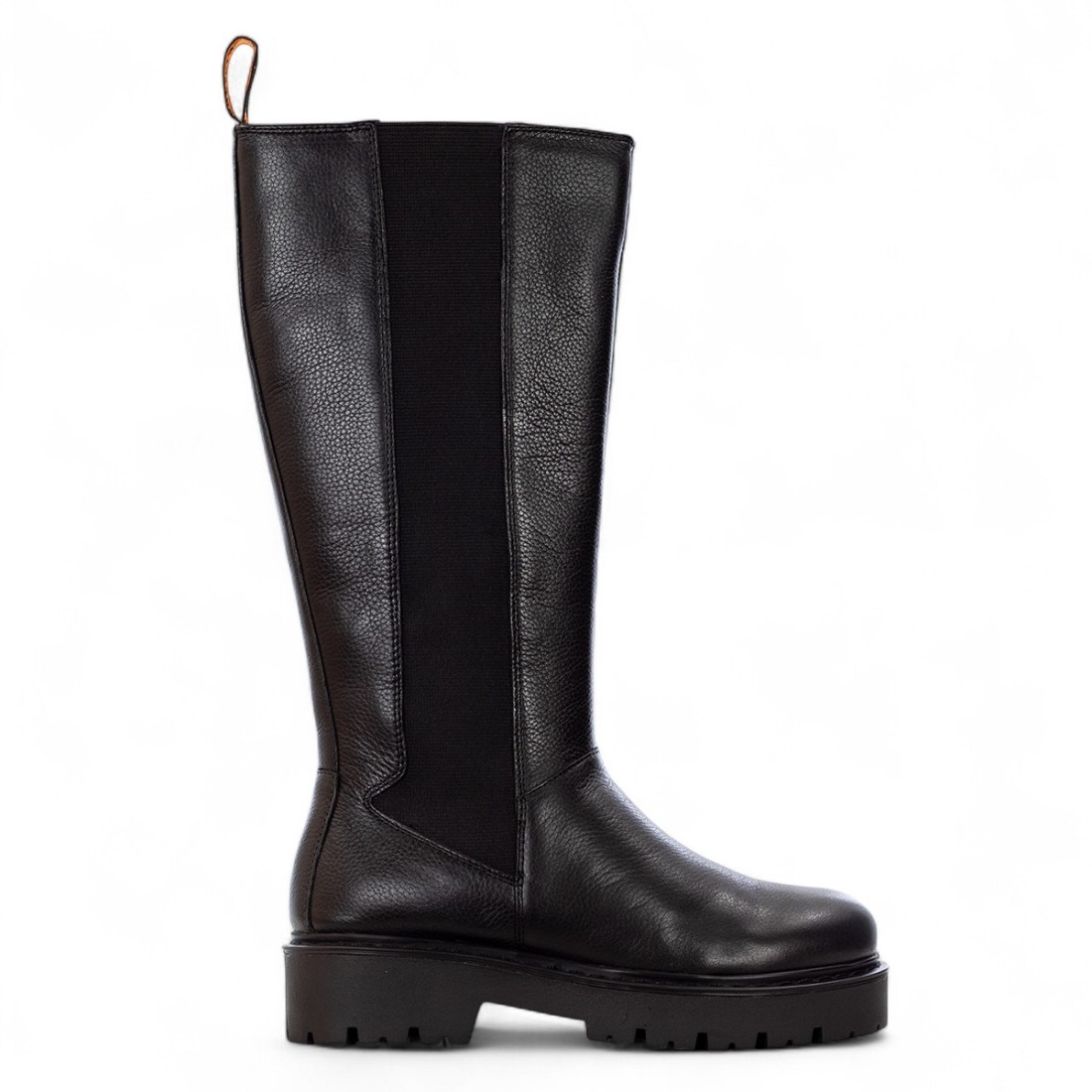 Shooters-Stiefel für Damen aus schwarzem, gehämmertem Leder mit einem vielseitigen und modernen Design. Ausgestattet mit einem praktischen Seitenreißverschluss und einem elastischen Einsatz für einen bequemen Sitz. Die 35 mm hohe Gummisohle sorgt für Stabilität und Komfort, während das Textilfutter und die Innensohle Weichheit und Atmungsaktivität garantieren. Perfekt, um jeden Look mit Stil und Zweckmäßigkeit zu vervollständigen.