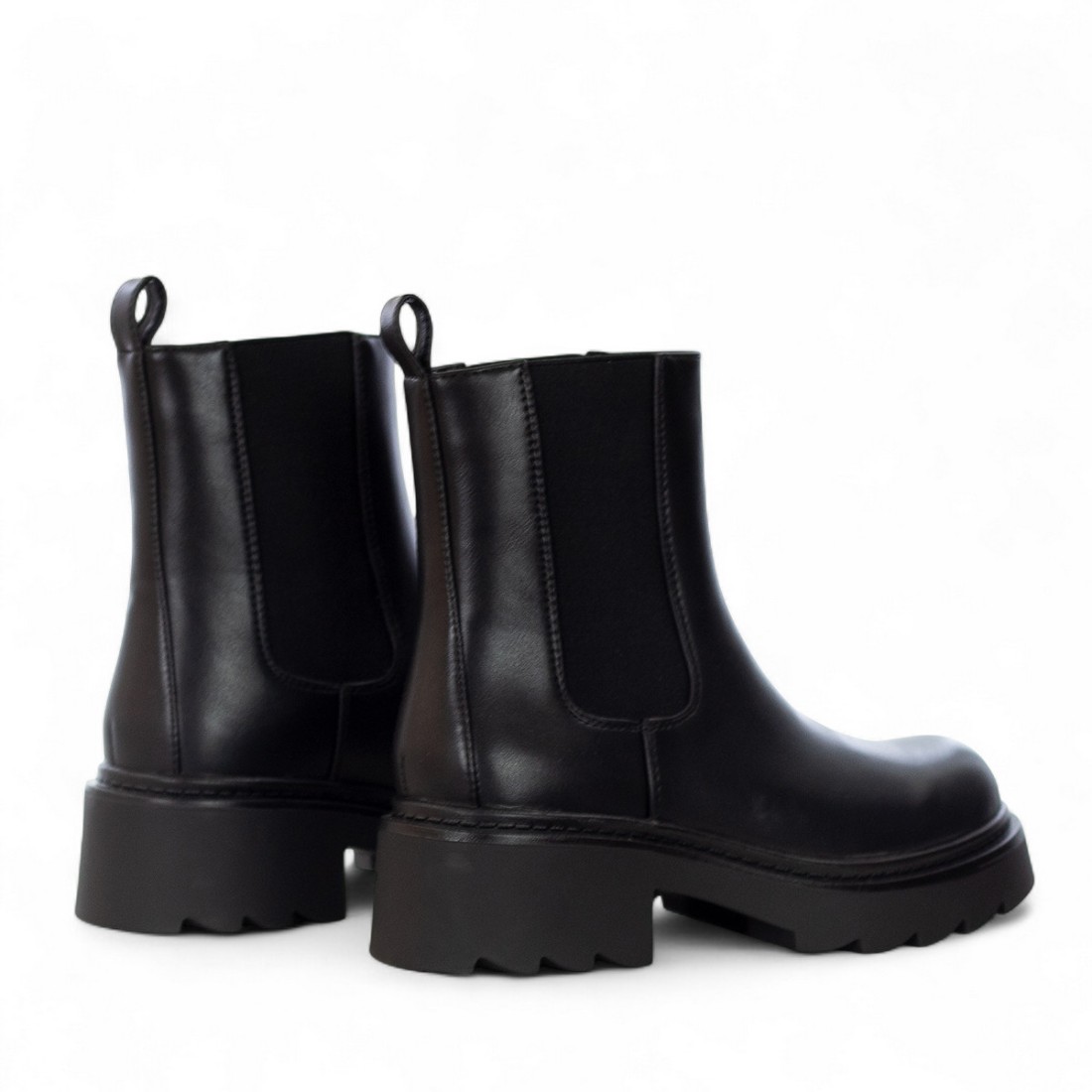 EXÉ Chelsea-Stiefelette aus schwarzem Lederimitat mit seitlichen Einsätzen aus elastischem Stoff für eine bequeme und anpassungsfähige Passform. 50-mm-Gummisohle für Stabilität und Stil, Futter und Innensohle aus Stoff für dauerhaften Komfort. Perfekt für vielseitige Looks, von lässig bis elegant.