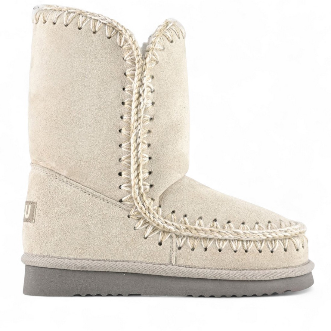 MOU-Stiefelette Eskimo 24 aus kreidefarbenem Wildleder, mit handgefertigten Häkelnähten und weichem, doppelseitigem Schaffellfutter für natürlichen Komfort. Das Mou Logo auf der Rückseite und die Gummisohle garantieren Stil und Zweckmäßigkeit, perfekt für alle, die auf der Suche nach kultigen und langlebigen Schuhen für die kalte Jahreszeit sind.