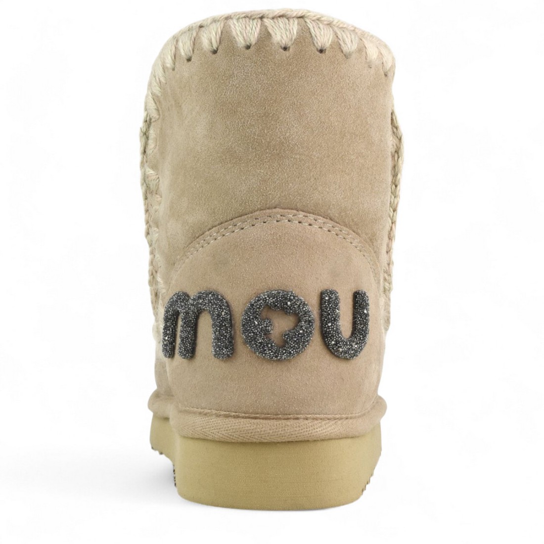 MOU Eskimo 18 Glitter Logo Stiefelette aus camelfarbenem Veloursleder mit Häkelnähten, warmem Schaffellfutter und Mou Logo aus Glitzer an der Ferse. Leicht, bequem und mit einem ikonischen Design ist sie ideal, um lässige und raffinierte Looks zu vervollständigen. Strapazierfähige Gummisohle für die perfekte Balance zwischen Stil und Komfort.Unser Kundenservice steht Ihnen von Montag bis Samstag von 10:00 bis 19:30 Uhr zur Verfügung