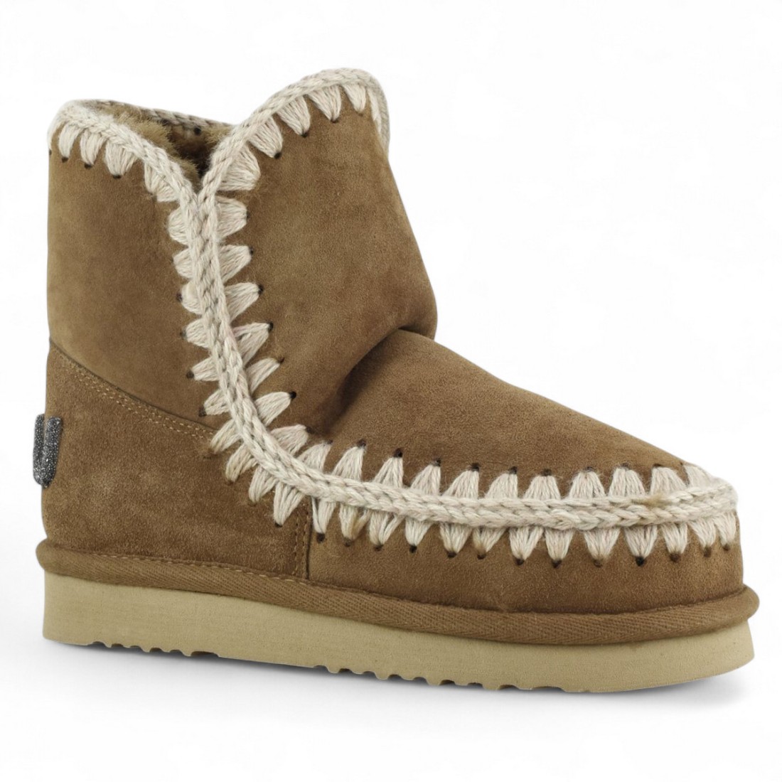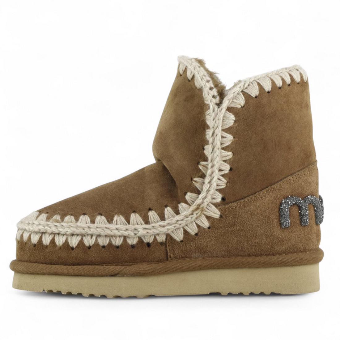 MOU Stiefelette Eskimo 18 Glitter Logo aus cognacfarbenem Veloursleder mit Häkelnähten, warmem Schaffellfutter und Mou Logo aus Glitter, das auf die Ferse genäht ist. Leicht, bequem und mit einem ikonischen Design ist er ideal, um lässige und raffinierte Looks zu vervollständigen. Strapazierfähige Gummisohle für die perfekte Balance zwischen Stil und Komfort.Unser Kundenservice steht Ihnen von Montag bis Samstag von 10:00 bis 19:30 Uhr zur Verfügung