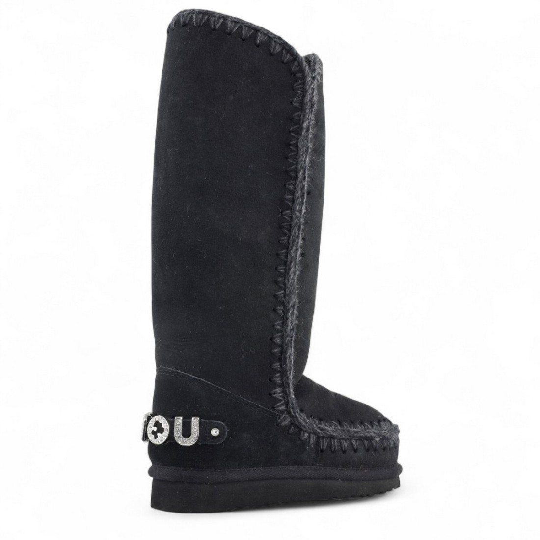 MOU Stiefel Eskimo 40 Rhinestones Logo aus schwarzem Wildleder, mit feinen Häkelnähten und warmem Schaffellfutter verarbeitet. Das Logo Mou aus Metall mit Strasssteinen verleiht dem Schuh einen unverwechselbaren Touch auf der Rückseite. Strapazierfähige Gummisohle für Komfort und Stil an kälteren Tagen.