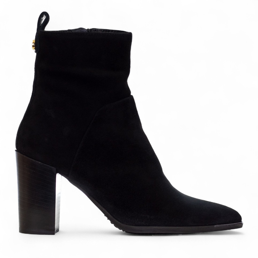 Ancamy-Stiefelette aus weichem schwarzem Samt, elegant und bequem. Ausgestattet mit seitlichem Reißverschluss für eine praktische Passform, 85 cm hohem Absatz, Lederfutter und Innensohle. Die Gummisohle garantiert Stabilität und Halt. Perfekt, um raffinierte Looks mit einem Hauch von Klasse und Weiblichkeit zu vervollständigen, ohne auf Komfort zu verzichten.