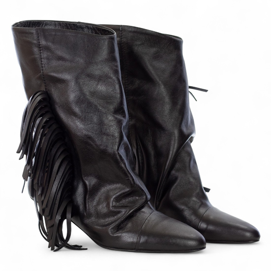 Weiche schwarze Lederstiefelette mit seitlichen Fransen, elegant und vielseitig. Der 60-mm-Absatz verschlankt die Figur, während das Lederfutter und die Innensohle ganztägigen Komfort garantieren. Die Gummisohle sorgt für Stabilität und ist damit ideal für einen schicken und raffinierten Look zu jeder Gelegenheit.