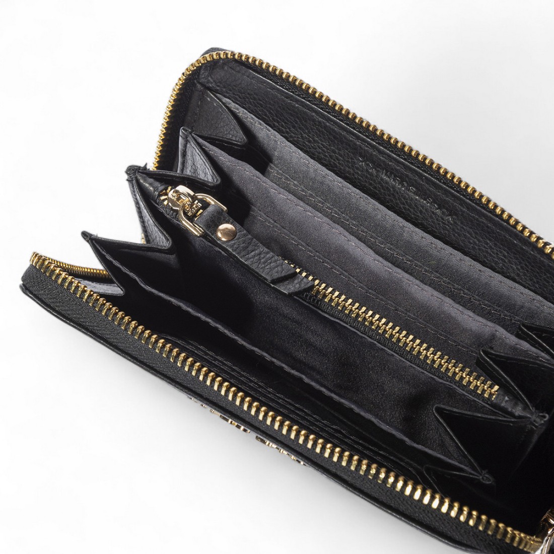 Elegantes Portemonnaie Marc Ellis aus schwarzem Echtleder mit feiner, gehämmerter Textur und geprägtem goldenem Logo. Der goldene Reißverschluss beherbergt einen geräumigen Innenraum mit vier Fächern, einem Münzfach mit Reißverschluss und einem Kartenhalter. Moderner Stil und hochwertige Handwerkskunst vereinen sich in einem kompakten 10x16 cm großen Accessoire, das perfekt für jede Gelegenheit ist.