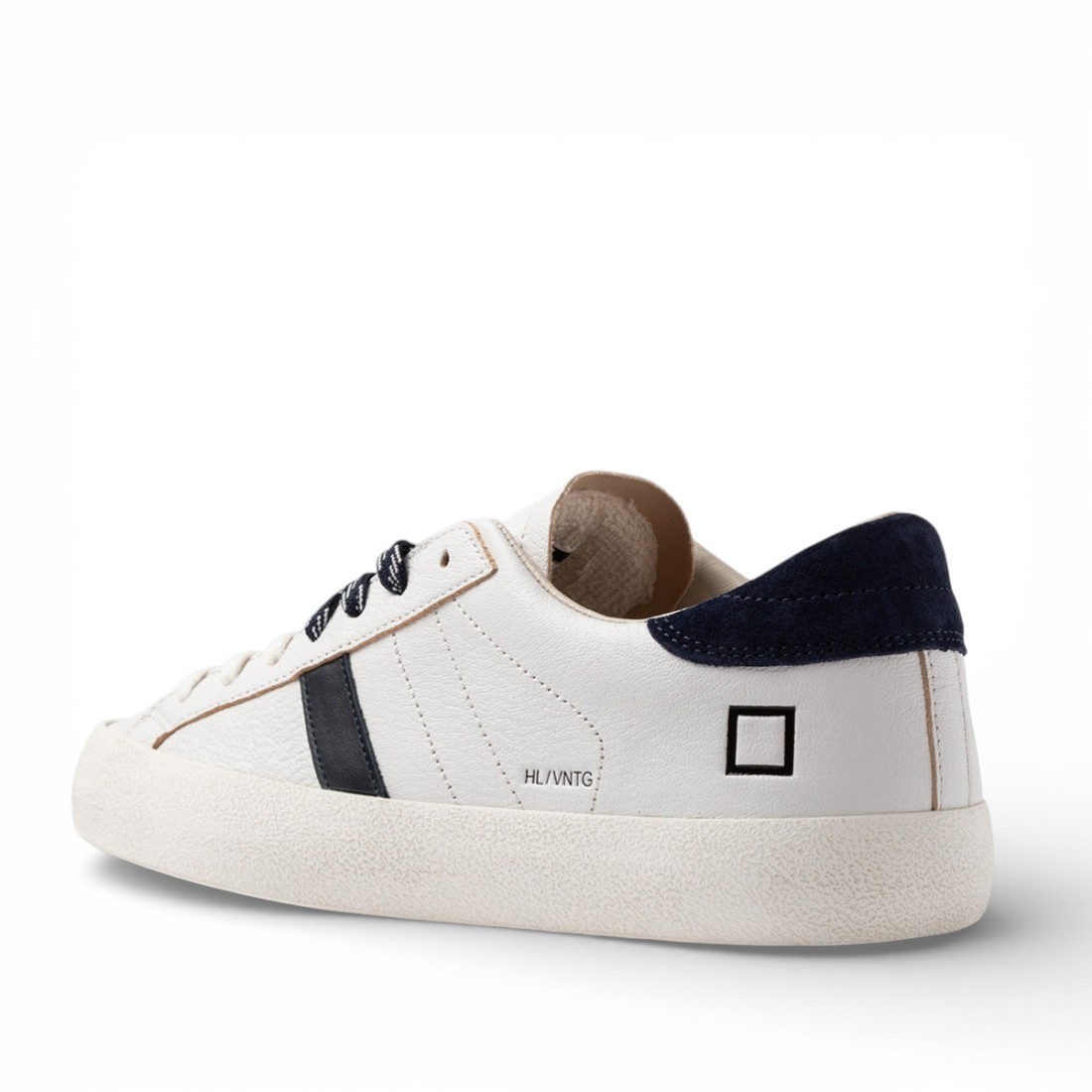 Niedrige D.A.T.E. Turnschuhe aus weißem, genarbtem Leder mit einem klaren und modernen Design. Ton-in-Ton-Lederzunge mit geprägtem Logo, Schnürsenkel aus Baumwolle und Polyester in zwei Farbvarianten. Quadratisches Logo und Modellname an der Seite aufgedruckt. Seitliches Lederband und dunkelblauer Wildlederabsatz. Innenfutter aus Leder und Baumwollfrottee. Gummisohle mit Zementeffekttextur, widerstandsfähig und körnig.