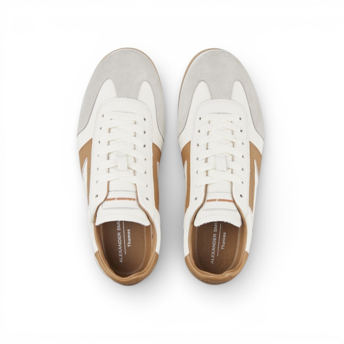 Die Thames Turnschuhe von Alexander Smith vereinen essentielles Design mit außergewöhnlichem Komfort. Die patentierte Stitch & Turn-Konstruktion garantiert Weichheit und Flexibilität und eliminiert die innere Steifheit. Das Obermaterial aus weißem Leder und grauem Wildleder mit kontrastierenden braunen Details, ein dezentes Logo und eine 25-mm-Sohle vervollständigen ein leichtes und vielseitiges Modell, perfekt für alle, die Stil suchen, ohne auf Komfort zu verzichten.