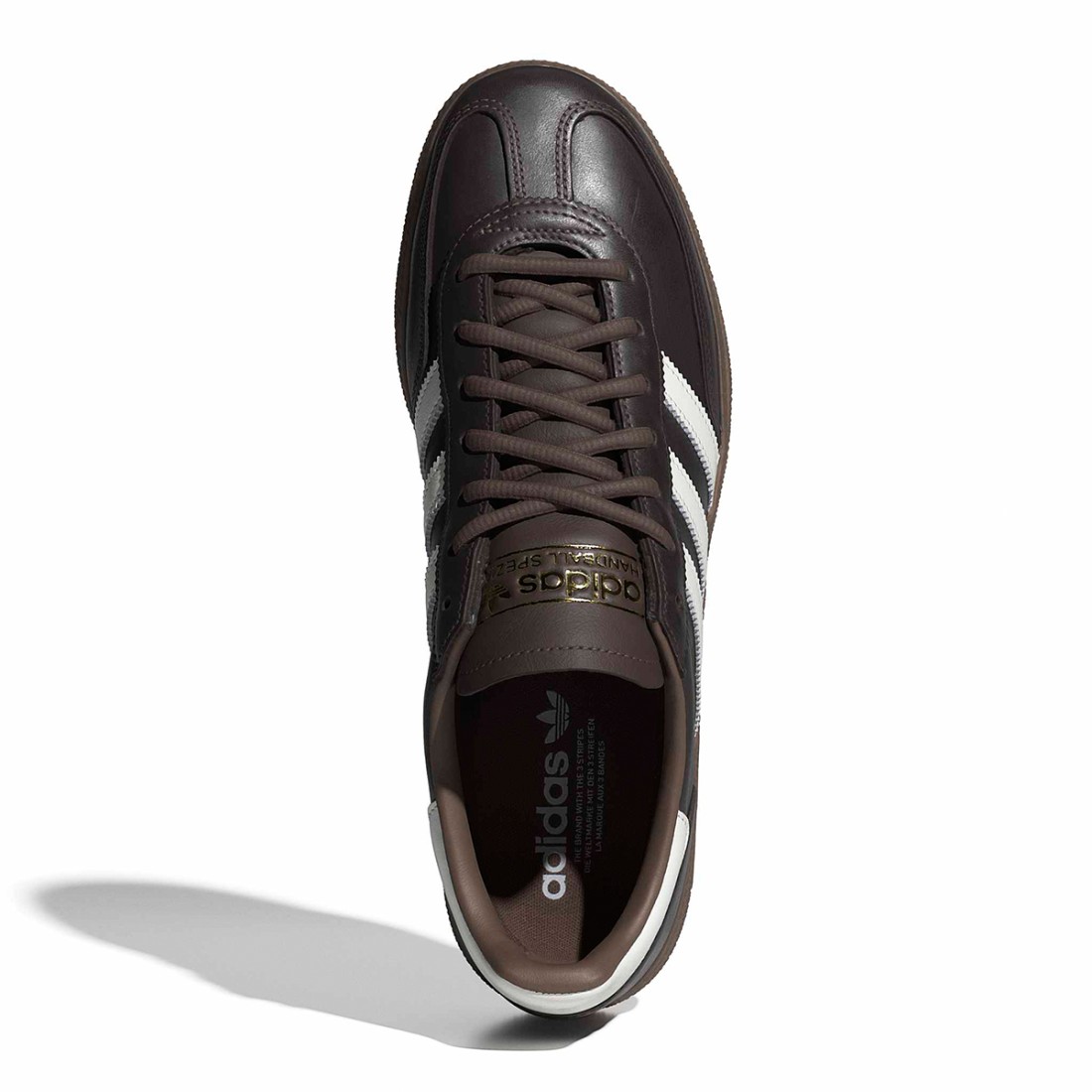Die Handball Spezial-Turnschuhe sind seit 1979 eine Ikone und verbinden die ursprüngliche sportliche Ästhetik mit einem alltäglichen Look. Das Obermaterial aus geöltem braunem Leder mit Streifen und Fersenverstärkung verleiht Charakter und zeitlosen Stil. Das Futter in Kunstlederoptik sorgt für Komfort, während die Sohle aus Naturkautschuk Grip und Strapazierfähigkeit bietet. Schnürsenkel für eine stabile Passform und das adidas Logo auf der Zunge und an den Seiten vervollständigen das Design.