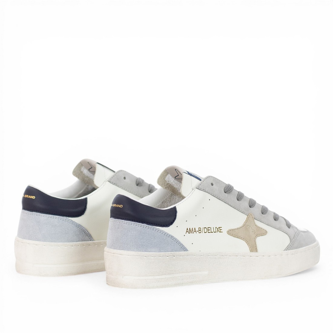 Entdecken Sie die AMA BRAND: weiße Lederschuhe mit grauen Wildlederdetails und einem eleganten dunkelblauen Aufnäher auf der Rückseite. Das beigefarbene Wildlederlogo und der Schriftzug an der Seite verleihen ihnen einen unverwechselbaren Touch. Bequem und langlebig, mit Textilfutter und Gummisohle, sind sie perfekt für einen urbanen, raffinierten Stil im Alltag.Unser Kundenservice steht Ihnen von Montag bis Samstag von 10:00 bis 19:30 Uhr zur Verfügung