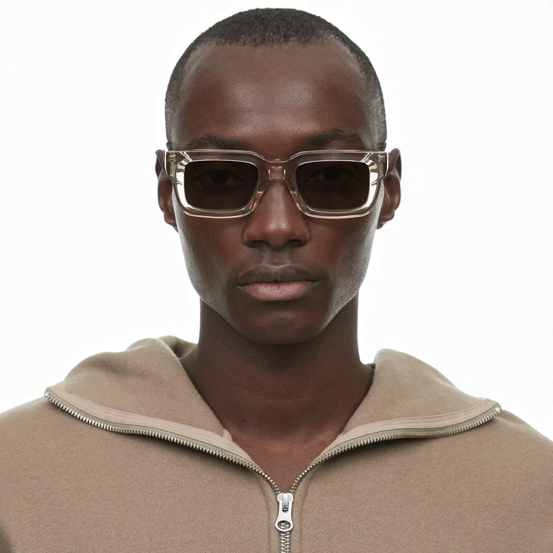 Kräftige Linien und ein minimalistisches Design bestimmen das Modell 05. Die quadratische Silhouette und die abgeschrägten Details an den Bügeln sorgen für elegante Eleganz. Die handgefertigte Brille aus transparentem Acetat in Ecru passt bequem auf mittlere bis große Köpfe. Getönte Gläser mit Blendschutz, 100% UVA/UVB-Schutz, kratz- und stoßfest, scharfe Sicht ohne Verzerrung.