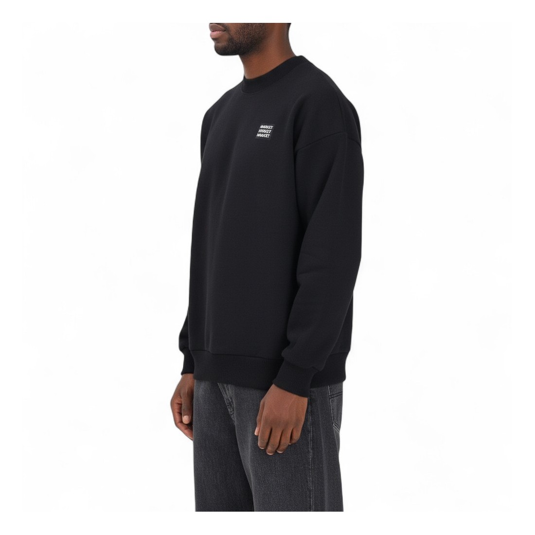 Schwarzes MARKET Herren-Sweatshirt mit klassischem Rundhalsausschnitt und normaler Passform. Gedrucktes "MARKET"-Logo auf der Brust und Maxi-Grafik auf dem Rücken für einen urbanen und modernen Stil. Das Sweatshirt aus weicher Baumwolle mit Rippbündchen an Kragen, Ärmeln und Saum sorgt für Komfort und Vielseitigkeit und ist ideal für einen trendigen Freizeitlook.