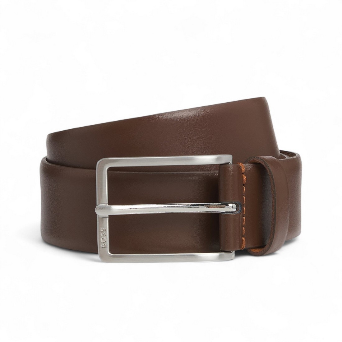 BOSS Herrengürtel aus feinem italienischen Leder mit gebürsteter Schnalle und eingraviertem Logo. Mit einer Breite von 3,5 cm verleiht er jedem Look einen Hauch von Eleganz. Mit silberfarbenen Metalldetails und geprägtem Logo auf der Außenseite. Für eine optimale Passform wählen Sie bitte eine Nummer größer als Ihren Taillenumfang. Das Leder stammt aus zertifizierten Gerbereien und besteht zu mindestens 80% aus hochwertigen Materialien.