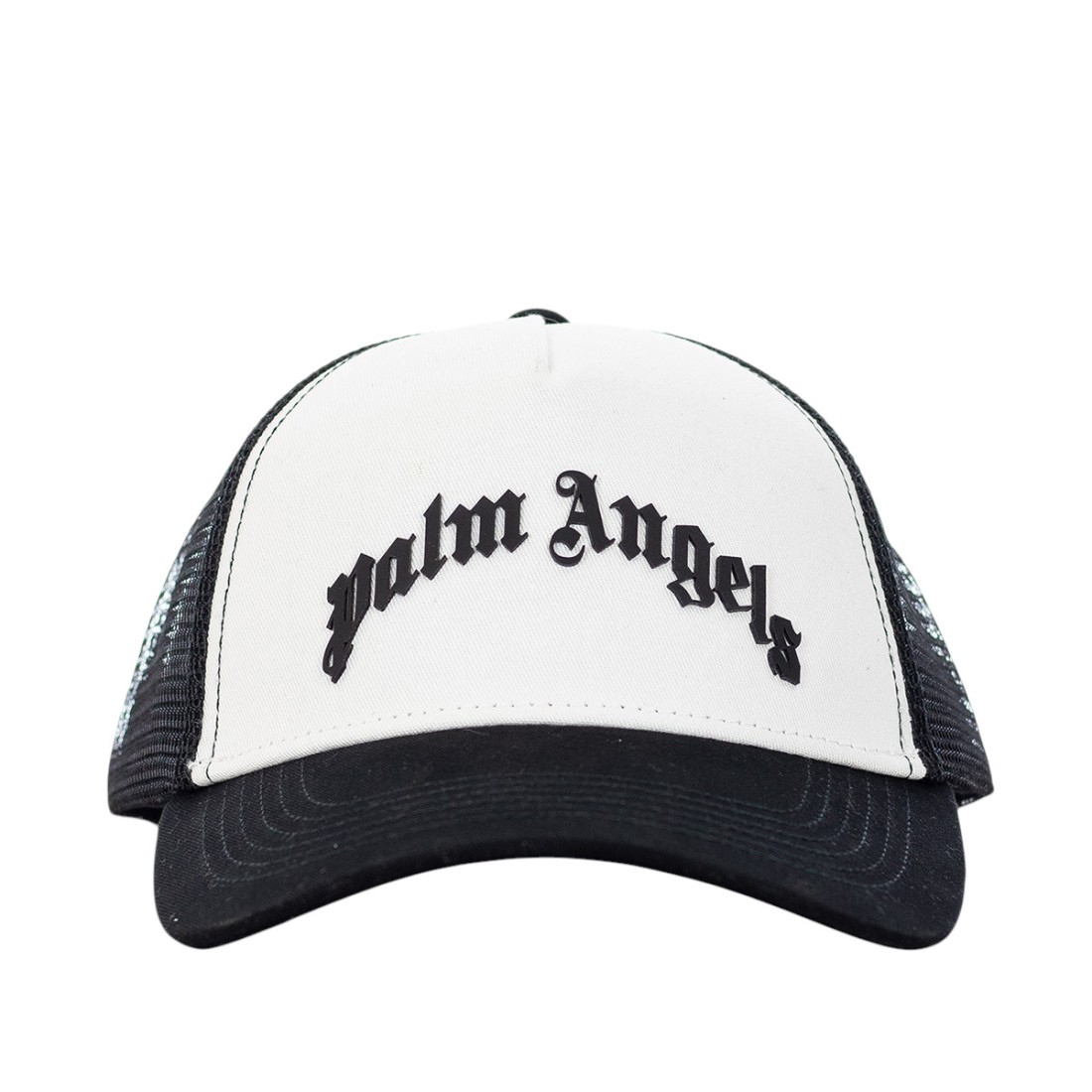 Palm Angels Baseballkappe aus zweifarbiger schwarzer und weißer Baumwolle mit atmungsaktiver Netzrückseite. Auf der Vorderseite befindet sich das geprägte gummierte Logo, das ikonische Detail der Marke. Verstellbarer Plastikverschluss auf der Rückseite für eine individuelle Passform. Artikel: PMLB068S26FAB0021010