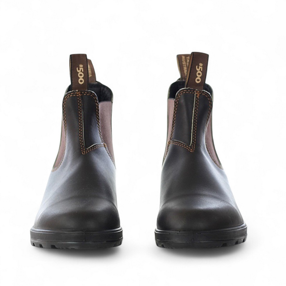 Die ikonische Stiefelette Blundstone #500 im Chelsea-Stil aus hochwertigem braunem, wetterfestem Leder. Ausgestattet mit seitlichen Gummizügen Ton in Ton, Laschen für eine einfache Passform und einer geriffelten Gummisohle mit erhöhtem Absatz und Logos für optimalen Halt. Leicht, bequem und langlebig dank des SPS Max Comfort Systems und der gepolsterten Zwischensohle. Ein zeitloser Klassiker aus der Originals-Serie, perfekt für jeden Tag.